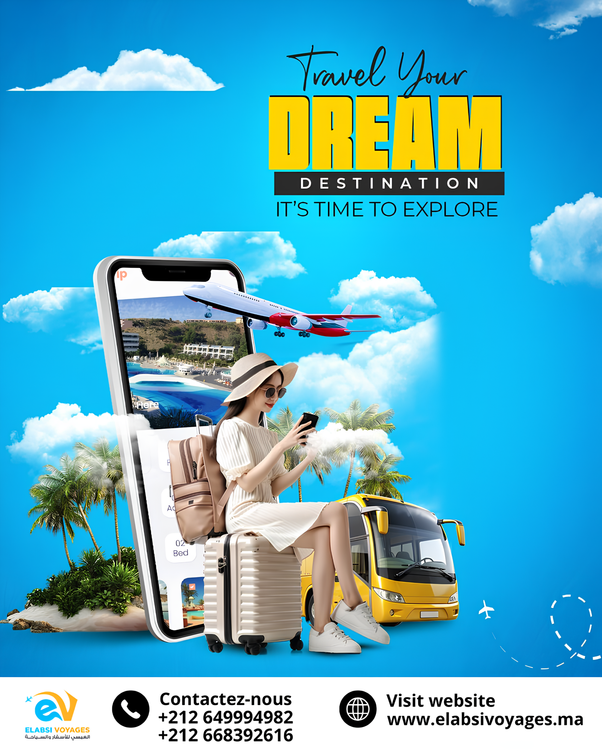 ELABSI VOYAGES est une agence de voyages spécialisée dans l’organisation de voyages nationaux et internationaux. Nous proposons à nos clients des services complets incluant la réservation de billets d’avion, l’organisation du transport et la sélection d’hébergements adaptés à leurs besoins. Notre objectif est de vous offrir des voyages bien organisés, confortables, mémorables grâce à un accompagnement professionnel et de rendre chaque voyage agréable et inoubliable.